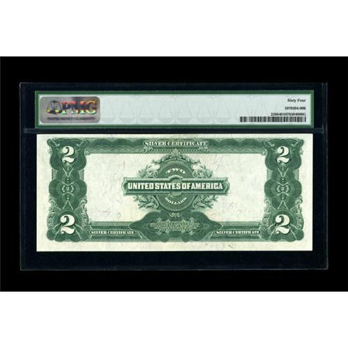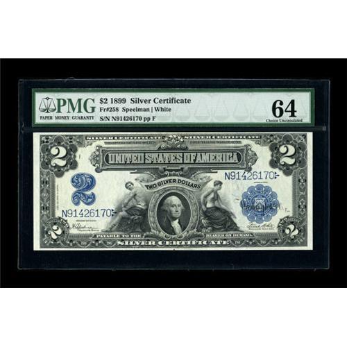 <B>Fr. 258 $2 1899 Silver Certificate PMG Choice Uncirculated 64.</B></I> The margin disparity along the top has caused this grade to be applied. Wonderful color is still present and this note should be well received.<B><BR></B></I><I>From The Drew Keough Collection</B></I><BR><BR><b>Shipping:</b> Coins & Currency (<a target="_blank" href="http://www.heritageauctions.com/common/shipping.php">view shipping information</a>)