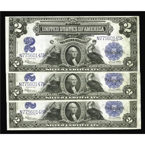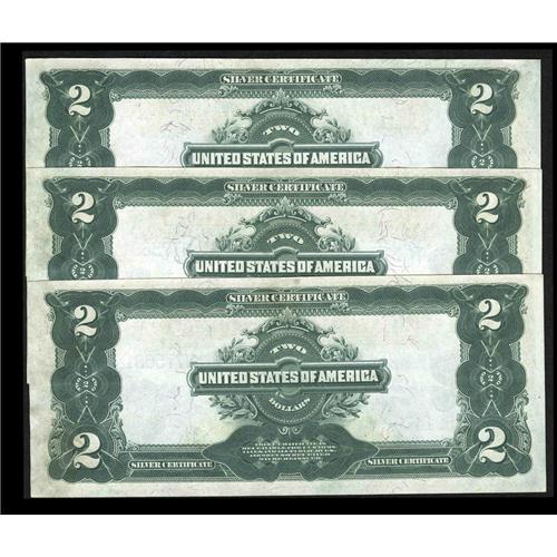 <B>Fr. 258 $2 1899 Silver Certificates. Three Examples. Choice New.</B></I> This trio that is one note from being consecutive just cries to be held by their next owner as they exhibit the meaningful traits of embossing (especially the Treasury Seal) and crackling fresh paper. A very faint paper clip indentation is noticed, but this may help account for the survival of this delightful grouping. Two of the notes have a tight top margin, but all three are original and very desirable.