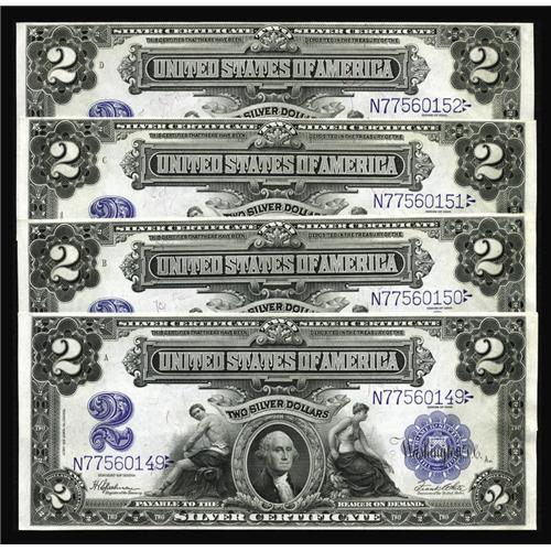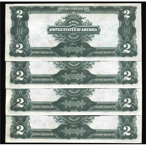 <B>Fr. 258 $2 1899 Silver Certificates Cut Sheet Of Four Very Choice New.</B></I> 1899 Deuces are far from a rare type, but it's a bit of a challenge to find well margined, fully bright and strictly uncirculated examples. These notes meet all those requirements and then some. They are nicely centered on both sides and have all the eye appeal in the world.