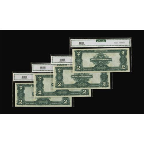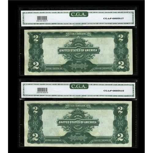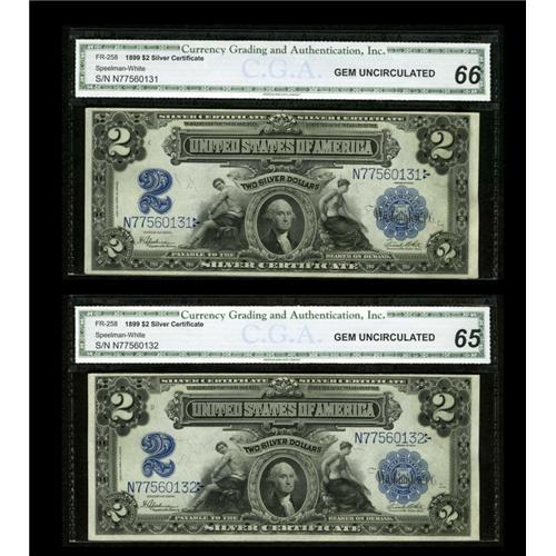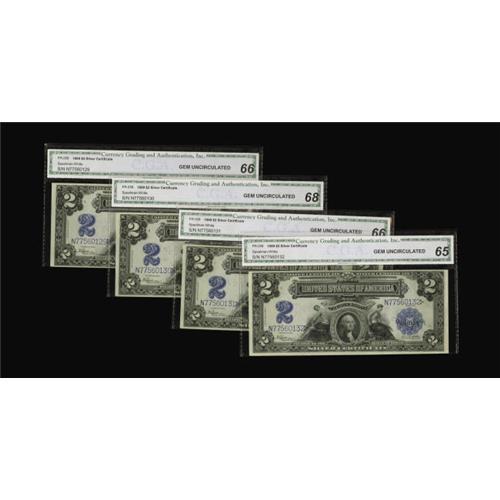 <B>Fr. 258 $2 1899 Silver Certificates Cut Sheet of Four Notes CGA Gem Uncirculated 65, 66 (2), 68.</B></I> This sheet yielded three Gems and one Superb Gem. Plenty of embossing and rich inks can be seen.