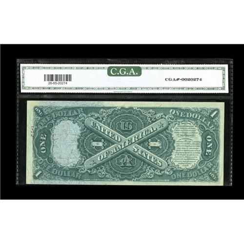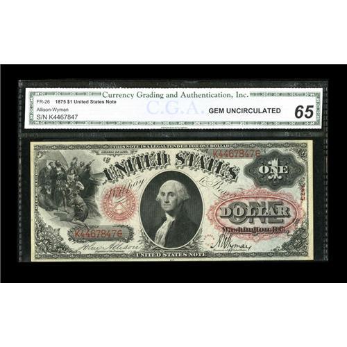 <B>Fr. 26 $1 1875 Legal Tender CGA Gem Uncirculated 65.</B></I> An 1875 Ace with super color, good centering and excellent eye appeal.