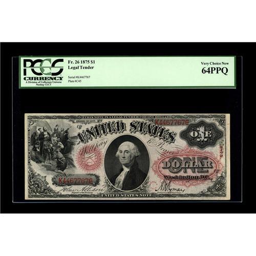 <B>Fr. 26 $1 1875 Legal Tender PCGS Very Choice New 64PPQ.</B></I> This is a brightly colored note that exhibits plenty of punch through embossing.<BR><BR><b>Shipping:</b> Coin/Currency (<a target="_blank" href="http://www.heritageauctions.com/common/shipping.php">view shipping information</a>)