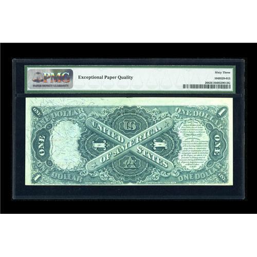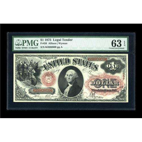<B>Fr. 26 $1 1875 Legal Tender PMG Choice Uncirculated 63 EPQ.</B></I> Apparently the back centering, which is quite low, caused the 63 grade, as this note sure looks like a 66 from the face. An attractive piece with good originality.<BR><BR><b>Shipping:</b> Coins & Currency (<a target="_blank" href="http://www.heritageauctions.com/common/shipping.php">view shipping information</a>)