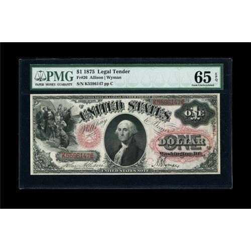 <B>Fr. 26 $1 1875 Legal Tender PMG Gem Uncirculated 65 EPQ.</B></I> This well preserved specimen has even margins on all sides and bright, flashy color.<BR><BR><b>Shipping:</b> Coins & Currency (<a target="_blank" href="http://www.heritageauctions.com/common/shipping.php">view shipping information</a>)