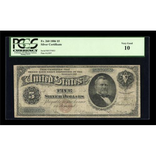 <B>Fr. 260 $5 1886 Silver Certificate PCGS Very Good 10.</B></I> Honest, even circulation is noticed on this Silver Dollar Back.<BR><I>From The Kansas City Collection.</B></I><BR><BR><b>Shipping:</b> Coins & Currency (<a target="_blank" href="http://www.heritageauctions.com/common/shipping.php">view shipping information</a>)
