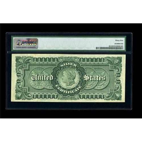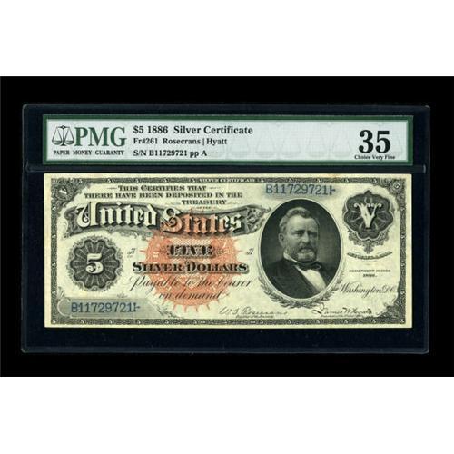 <B>Fr. 261 $5 1886 Silver Certificate PMG Choice Very Fine 35.</B></I> The surfaces of this Silver Dollar Back remain intact and the color is pleasing. Nicely margined, with this grade being most elusive for the design.<BR><BR><b>Shipping:</b> Coins & Currency (<a target="_blank" href="http://www.heritageauctions.com/common/shipping.php">view shipping information</a>)