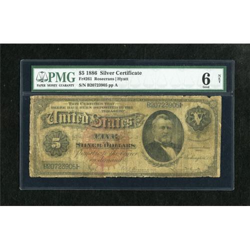 <B>Fr. 261 $5 1886 Silver Certificate PMG Good 6.</B></I> The "net" modifier on this Silver Dollar Back is due to "splits" as mentioned on the third-party label. <BR><BR><b>Shipping:</b> Coins & Currency (<a target="_blank" href="http://www.heritageauctions.com/common/shipping.php">view shipping information</a>)