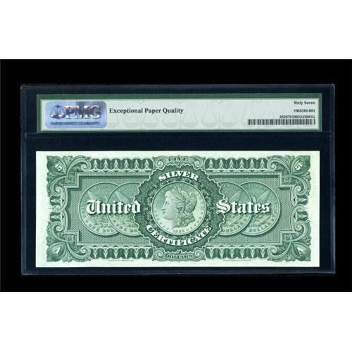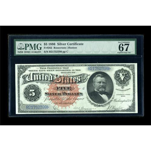 <B>Fr. 262 $5 1886 Silver Certificate PMG Superb Gem Unc 67 EPQ.</B></I> We sold another Fr. 262 graded PMG 67 EPQ in our January 2007 FUN auction, where it realized $54,625. Fr. 262 is not a rare number, but the far-more-common Fr. 263 is the piece associated with ultra-high grade Silver Dollar backs. This note is an absolute beauty with broad margins, perfect color, razor-sharp print quality, and magnetic eye appeal. It's fully the equal, if not slightly superior to, the note that we sold in 2007. We would certainly expect this great note to equal or surpass that previous record price.<BR><BR><b>Shipping:</b> Coins & Currency (<a target="_blank" href="http://www.heritageauctions.com/common/shipping.php">view shipping information</a>)