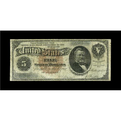 <B>Fr. 262 $5 1886 Silver Certificate Very Good.</B></I> A somewhat scarcer signature combination within the Silver Dollar Back design type, with only about 50 notes known. A nice entry level note for the collector subject to budget constraints.
