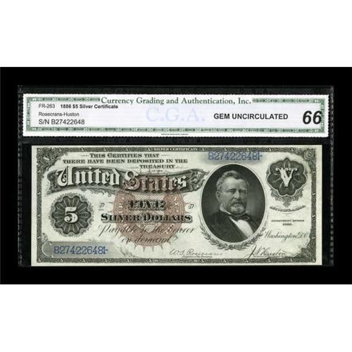 <B>Fr. 263 $5 1886 Silver Certificate CGA Gem Uncirculated 66.</B></I> Ideal front to back centering and solid margins are noted on this bright and deeply printed Silver Dollar Back. Recent interest from collectors has helped this note rank among the favorite all time designs on US Currency.<BR><BR><b>Shipping:</b> Coins & Currency (<a target="_blank" href="http://www.heritageauctions.com/common/shipping.php">view shipping information</a>)