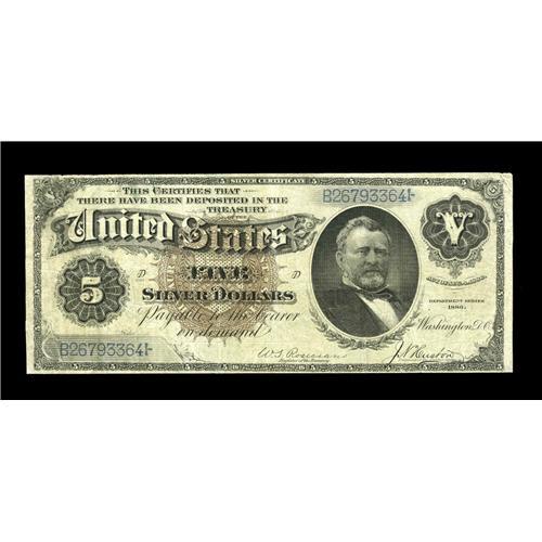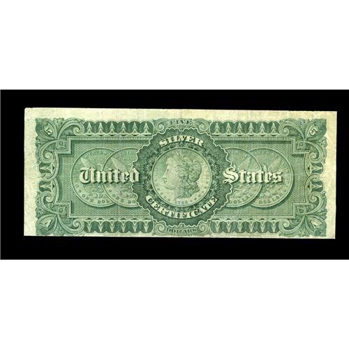 <B>Fr. 263 $5 1886 Silver Certificate Fine-Very Fine.</B></I> The back is centered low on this pleasing silver dollar back example which has sustained a well done corner repair.