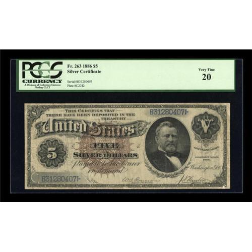 <B>Fr. 263 $5 1886 Silver Certificate PCGS Very Fine 20.</B></I> This is an evenly circulated, lightly toned example.<BR><I>From The Kansas City Collection.</B></I><BR><BR><b>Shipping:</b> Coins & Currency (<a target="_blank" href="http://www.heritageauctions.com/common/shipping.php">view shipping information</a>)