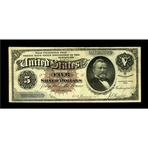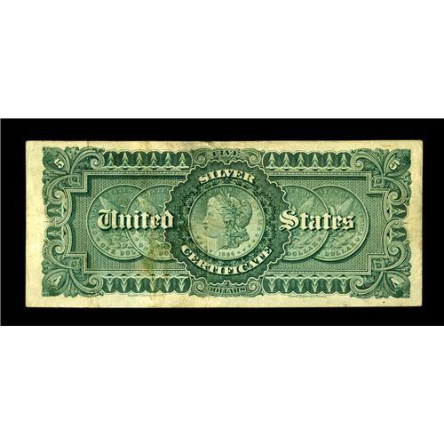 <B>Fr. 263 $5 1886 Silver Certificate Very Fine.</B></I> A deftly repaired tear is found at top center while even circulation claims the rest of the note save for a small patch of very light soiling.<BR><BR><b>Shipping:</b> Coin/Currency (<a target="_blank" href="http://www.heritageauctions.com/common/shipping.php">view shipping information</a>)