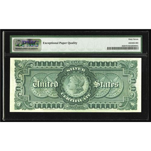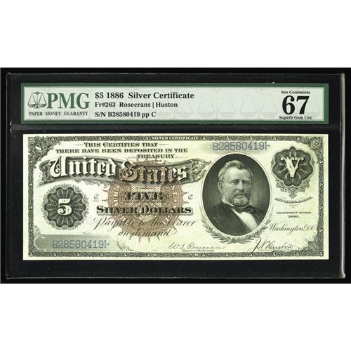 <B>Fr. 263 $5 1886 Silver Certificate PMG Superb Gem Unc 67.</B></I> This Silver Dollar Back has the comment, "Exceptional Paper Quality" on the back. This type has always been extremely popular due in large part to the five Morgan Silver Dollars that are the main features of the back engraving. It's hard to estimate notes like this, as the truly strong interest in high graded third-party material has just begun to build in the past six months. Suffice it to say there are far more people seeking out material in these holders than there are notes to fill them. We'll guess at the estimate here, but suspect we may be well short.