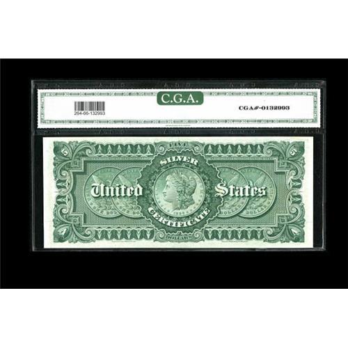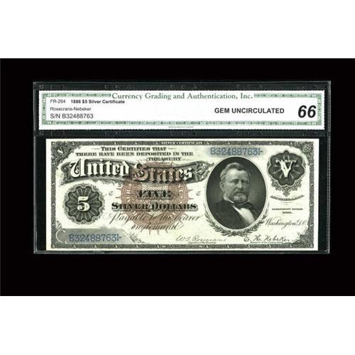 <B>Fr. 264 $5 1886 Silver Certificate CGA Gem Uncirculated 66.</B></I> Even margins and ideal front to back centering are noted on this Silver Dollar Back. Almost ten times as many Fr. 263s are known in Uncirculated states of preservation as Fr. 264s, making the Fr. 263 responsible for most of the Gem and better issues that are seen at auction.<BR><BR><b>Shipping:</b> Coins & Currency (<a target="_blank" href="http://www.heritageauctions.com/common/shipping.php">view shipping information</a>)