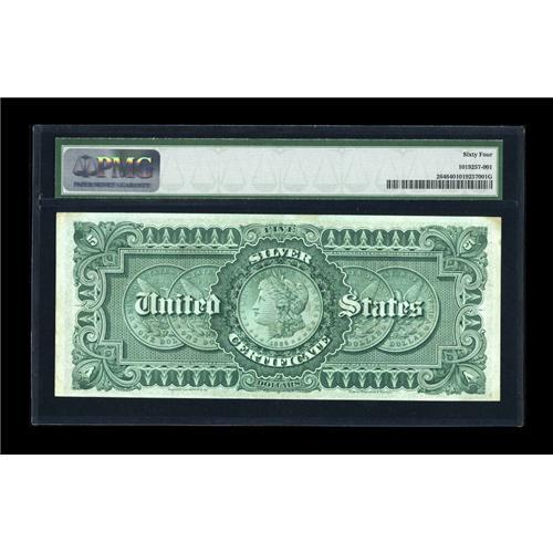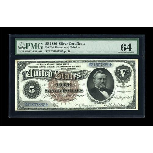 <B>Fr. 264 $5 1886 Silver Certificate PMG Choice Uncirculated 64.</B></I> Minor aging of the upper corners appears to be what has held the grade down on this otherwise Gem appearing Large Brown Seal Silver Dollar Back. Fr. 264 is a much scarcer number of the type--particularly in high grade.<BR><BR><b>Shipping:</b> Coins & Currency (<a target="_blank" href="http://www.heritageauctions.com/common/shipping.php">view shipping information</a>)