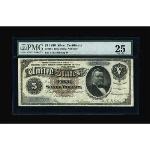 <B>Fr. 264 $5 1886 Silver Certificate PMG Very Fine 25.</B></I> Fr. 264 is considerably scarcer than its type-mate, the other Large Brown Seal Silver Dollar Back, Fr. 263 with a touch over 50 264s known and 232 263s. <B><BR></B></I><I>From The John Ameen Collection</B></I><BR><BR><b>Shipping:</b> Coins & Currency (<a target="_blank" href="http://www.heritageauctions.com/common/shipping.php">view shipping information</a>)