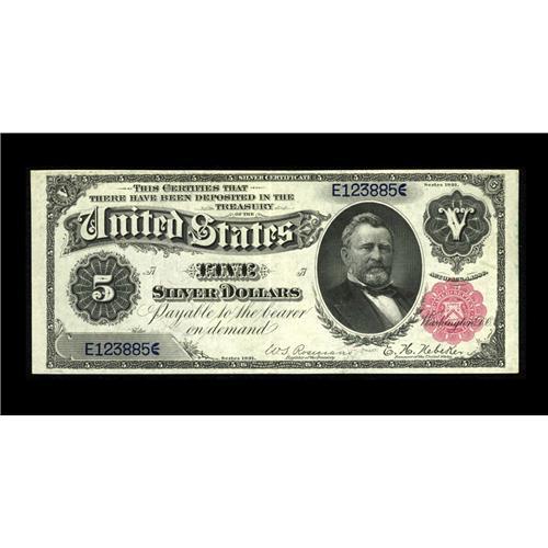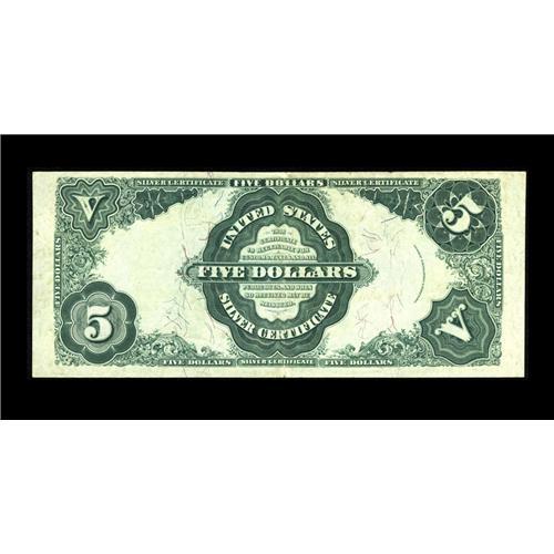 <B>Fr. 266 $5 1891 Silver Certificate About New.</B></I> Completely original and a gem but for a single fairly hard center fold. This is the nicest of this infrequently encountered Friedberg number that we have had in several years.<BR><I>From The Bill and Kathy Stella Currency Collection</B></I><BR><BR><b>Shipping:</b> Coin/Currency (<a target="_blank" href="http://www.heritageauctions.com/common/shipping.php">view shipping information</a>)