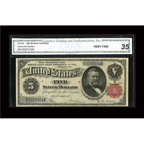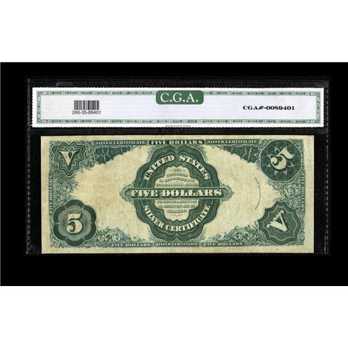 <B>Fr. 266 $5 1891 Silver Certificate CGA Very Fine 35.</B></I> This piece features the "Open Back" design that followed the silver dollar back design. The purpose of the revised design was to allow viewers to see the anti-counterfeiting threads more clearly. The colors are overall very bright though some bleeding is noted on the seal, which is common among many moderately circulated examples.