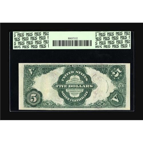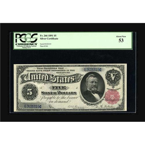 <B>Fr. 266 $5 1891 Silver Certificate PCGS About New 53.</B></I> These open back 1891 $5s are considerably scarcer than the higher priced and higher touted 1886 Silver $1 backs which share the same face design. This handsome note has good color, and strong eye appeal.<BR><BR><b>Shipping:</b> Coin/Currency (<a target="_blank" href="http://www.heritageauctions.com/common/shipping.php">view shipping information</a>)