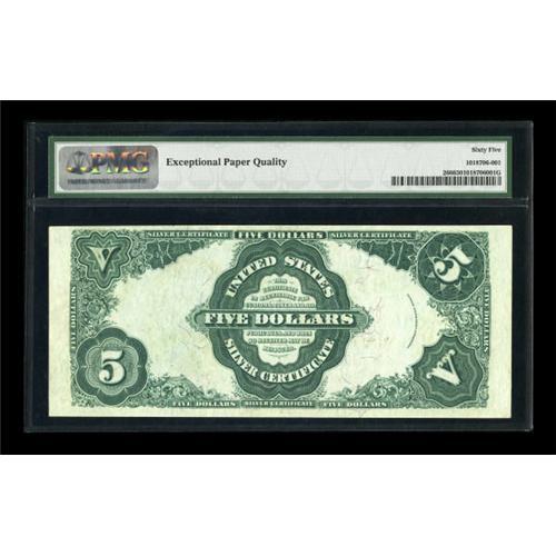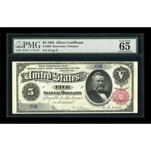 <B>Fr. 266 $5 1891 Silver Certificate PMG Gem Uncirculated 65 EPQ.</B></I> This wholly original and wildly attractive Gem holds the price records for this issue. It realized $18,400 in its auction debut in late 2005. PMG's population report reveals that only three pieces have been graded New, with this being the finest known to date. This piece was the last note on the second sheet printed and bears the single digit serial number E8. The Series 1891 $20 Silver Certificate bearing serial number E8 is also offered in this auction. In September of 2006, the Serial Number E8 PCGS graded 67PPQ Fr. 298 $10 Silver Certificate sold for $69,000 in our Long Beach Auction.<BR><BR><b>Shipping:</b> Coins & Currency (<a target="_blank" href="http://www.heritageauctions.com/common/shipping.php">view shipping information</a>)