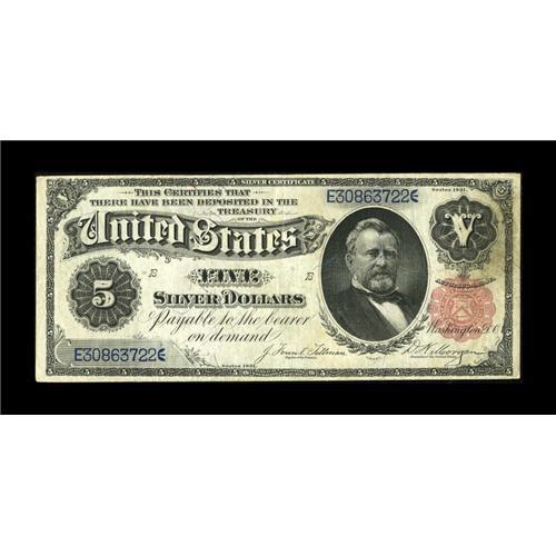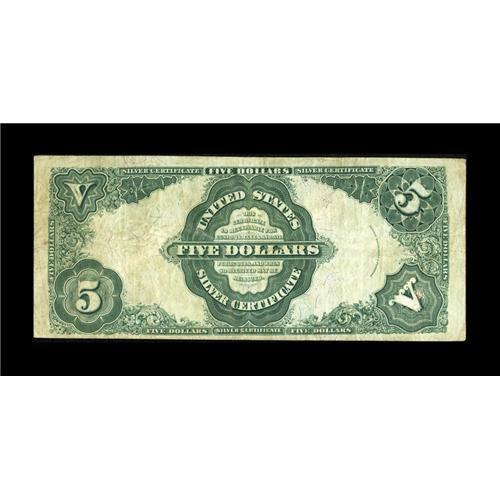 <B>Fr. 267 $5 1891 Silver Certificate Fine-Very Fine.</B></I> This is a moderately circulated Open Back example that retains crisp paper, nice colors, and eye appeal. This design type is scarcer than the more popular Silver Dollar Back and as such perhaps represents great value for the next purchaser. A small spot of lost ink is noticed on the back.<BR><I>From The Collection of Greg Southward</B></I><BR><BR><b>Shipping:</b> Coins & Currency (<a target="_blank" href="http://www.heritageauctions.com/common/shipping.php">view shipping information</a>)