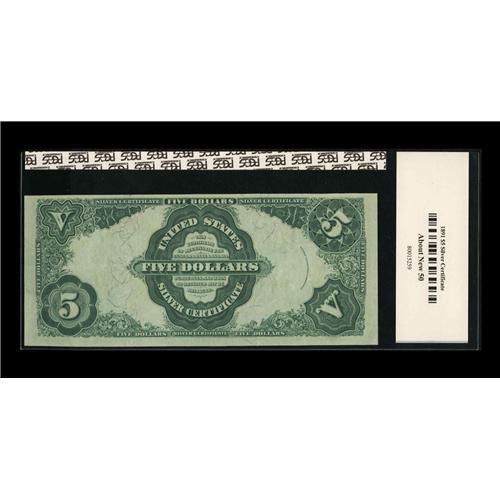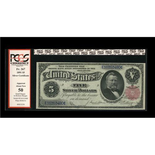 <B>Fr. 267 $5 1891 Silver Certificate PCGS Apparent About New 50.</B></I> This red-holdered PCGS holder comments, "Small repair in bottom margin." The note has a very nice appearance.