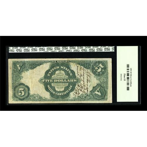 <B>Fr. 267 $5 1891 Silver Certificate PCGS Fine 15. Courtesy Autograph.</B></I> The back of this well centered certified note bears the courtesy autograph of D.N. Morgan, whose engraved signature appears on the face as Treasurer of the United States. A great note for the collector.<BR><BR><b>Shipping:</b> Coins & Currency (<a target="_blank" href="http://www.heritageauctions.com/common/shipping.php">view shipping information</a>)