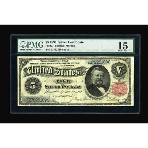 <B>Fr. 267 $5 1891 Silver Certificate PMG Choice Fine 15.</B></I> The margins are broad for the issue and the printed details remain bold.<BR><BR><b>Shipping:</b> Coins & Currency (<a target="_blank" href="http://www.heritageauctions.com/common/shipping.php">view shipping information</a>)