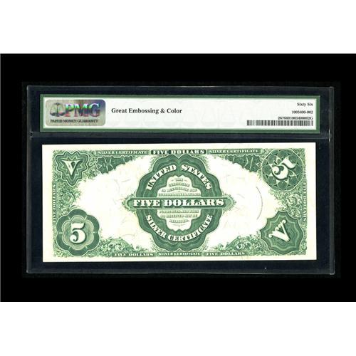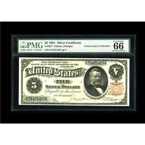 <B>Fr. 267 $5 1891 Silver Certificate PMG Gem Uncirculated 66.</B></I> The certification agency adds the additional comment, "Great color and embossing." This nicely centered note, with the open back design is actually scarcer than the Silver Dollar Back with which it shares a common face, should sell for no less than...<BR><BR><b>Shipping:</b> Coin/Currency (<a target="_blank" href="http://www.heritageauctions.com/common/shipping.php">view shipping information</a>)