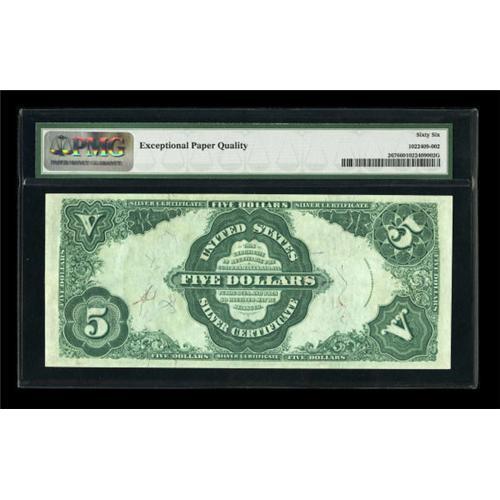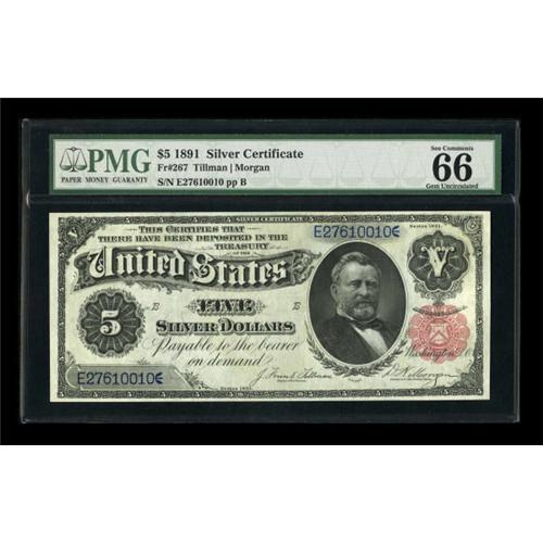 <B>Fr. 267 $5 1891 Silver Certificate PMG Gem Uncirculated 66 EPQ.</B></I> This piece was part of a small run of uncirculated notes that surfaced in the 1980s and was included in a 1981 NASCA sale where it realized a hefty sum of $850. The days of finding 1891 $5 Silvers in Gem for less than $1000 are long gone. Some embossing of the major design details is still visible even in the third party holder. The paper is exceptional with deeply printed devices.<BR><BR><b>Shipping:</b> Coins & Currency (<a target="_blank" href="http://www.heritageauctions.com/common/shipping.php">view shipping information</a>)