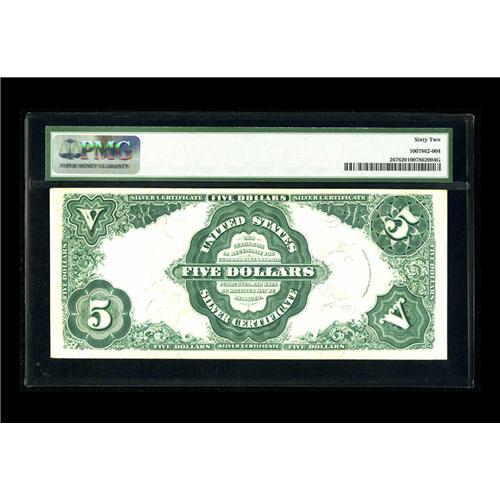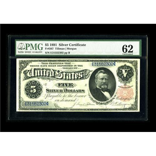 <B>Fr. 267 $5 1891 Silver Certificate PMG Uncirculated 62.</B></I> While not as wildly popular as the silver dollar reverse $5s from 1886, high grade Grant notes from this later series are just a scarce. The note offered here exhibits crisp corners and is free from folds. The colors remain bright for the grade and the margins sizeable.<BR><BR><b>Shipping:</b> Coin/Currency (<a target="_blank" href="http://www.heritageauctions.com/common/shipping.php">view shipping information</a>)