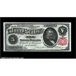 Fr. 267 $5 1891 Silver Certificate Superb Gem New. This and the following lot are the only consecutive pair that we known of for this scarce type. This two-number type is represented by over 200 pieces, with Fr. 266 and 267 combined, but the huge majority are circulated, and most of the high-end examples have centering or surface problems. This piece is a hugely margined, 100% fully bright, simply flawless, original beauty, with all its deep embossing, perfect centering of both sides and ideal colors. It's simply the ultimate example of the type. Important notice: We expect to be auctioning lots at the rate of 200-250 per hour. Sometimes eBay Premier live bid software cannot keep up with that pace, so we strongly recommend that you place a realistic proxy bid now as insurance to avoid disappointment. Also please note that all Heritage/CAA lots purchased through eBay Premier carry a 20% Buyer's Premium. Please make sure you read the Terms and Conditions.