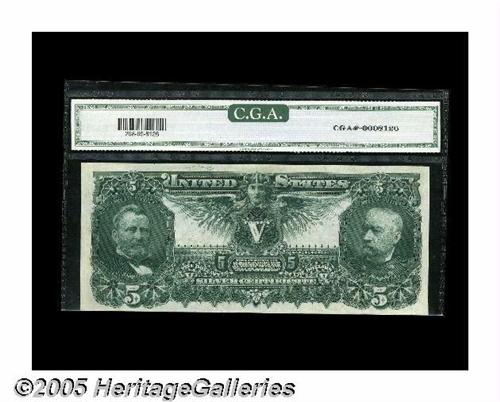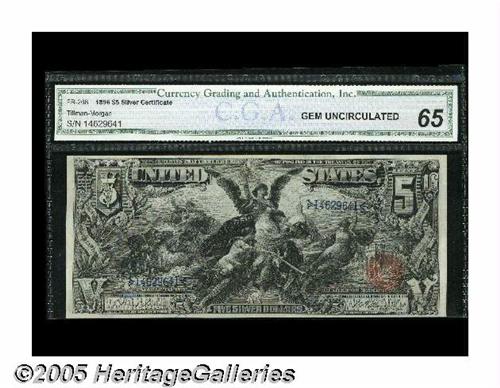 <B>Fr. 268 $5 1896 Silver Certificate CGA Gem Uncirculated 65.</B></I> This note only has one prior auction appearance, which was when we sold it in our January 2000 Sale prior to its certification. It's a very nicely margined note with bold color and strong eye appeal.