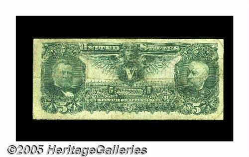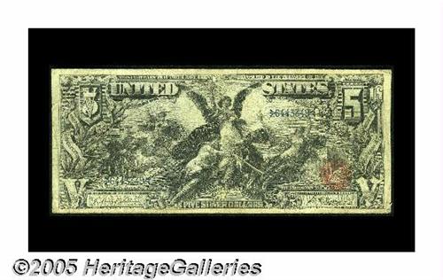 <B>Fr. 268 $5 1896 Silver Certificate Fine.</B></I> The lower right-hand margin reveals a tiny nick on this mid-grade $5 Ed.