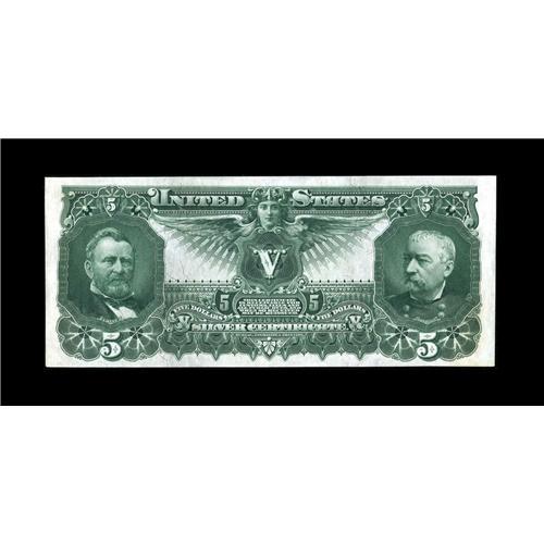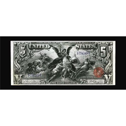 <B>Fr. 268 $5 1896 Silver Certificate Gem New.</B></I> Well printed with strong color and excellent centering. Original paper surfaces also add to the desirability of this piece. This Educational Five is, in most peoples opinion, the most attractive of any of our nineteenth century currency types.