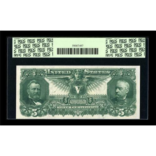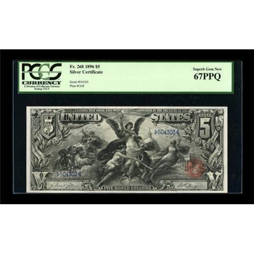 <B>Fr. 268 $5 1896 Silver Certificate PCGS Superb Gem New 67PPQ.</B></I> This is one of the very finest Five Dollar Eds that we have had the opportunity to handle. The broad boardwalk margins are nearly perfect. The color and eye appeal are simply magnetic and this note simply cannot be improved upon. Certainly the number of examples in this grade will never be great. This piece has never been offered publicly before, as it has been secured for the past century in a longtime family holding.<BR><BR><b>Shipping:</b> Coins & Currency (<a target="_blank" href="http://www.heritageauctions.com/common/shipping.php">view shipping information</a>)