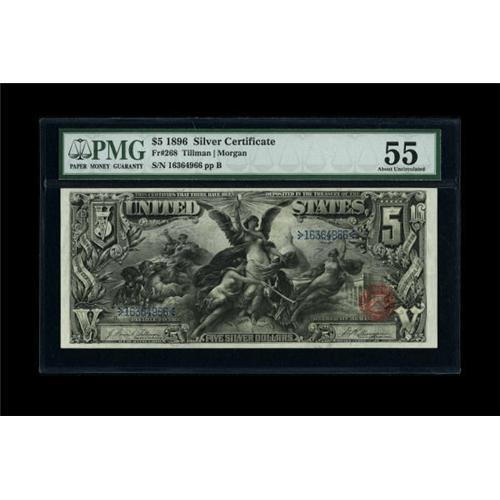 <B>Fr. 268 $5 1896 Silver Certificate PMG About Uncirculated 55.</B></I> This note is a new entrant into the census. It has retained its vibrant color and is boldly printed. It's well centered between four broad margins. It is an especially attractive note that has been lightly handled at the lower left.<BR><BR><b>Shipping:</b> Coins & Currency (<a target="_blank" href="http://www.heritageauctions.com/common/shipping.php">view shipping information</a>)