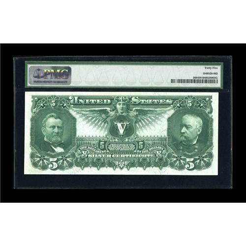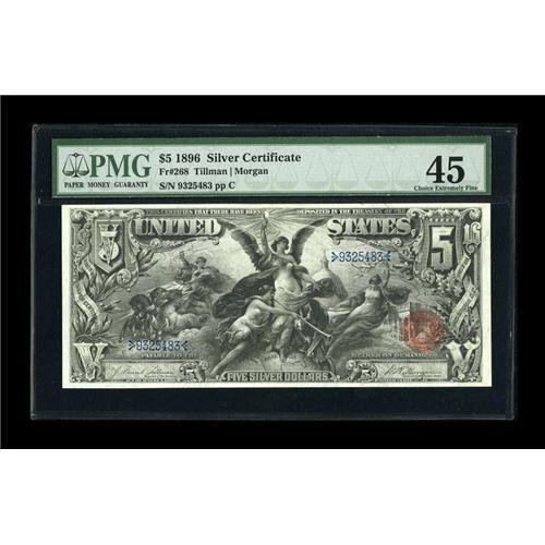 <B>Fr. 268 $5 1896 Silver Certificate PMG Choice Extremely Fine 45.</B></I> A very handsome $5 Educational with the margins, color, and eye appeal of a perfect Gem. Once holdered, nice XFs, which generally have three light folds, are impossible to decipher from far higher grade examples. There is absolutely no difference in appearance between this super piece and a note that would grade 20+ points higher. A terrific buy for the collector who values Superb appearance over technical grade.<BR><I>From The Bill and Kathy Stella Currency Collection</B></I><BR><BR><b>Shipping:</b> Coins & Currency (<a target="_blank" href="http://www.heritageauctions.com/common/shipping.php">view shipping information</a>)