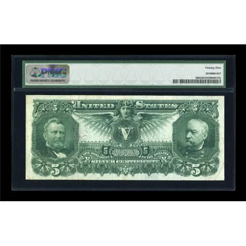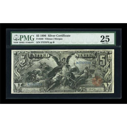 <B>Fr. 268 $5 1896 Silver Certificate PMG Very Fine 25.</B></I> Even margins surround this lovely example that has stood the test of time. Despite the circulation it has remained free of problems often seen at this grade level.<BR><BR><b>Shipping:</b> Coins & Currency (<a target="_blank" href="http://www.heritageauctions.com/common/shipping.php">view shipping information</a>)