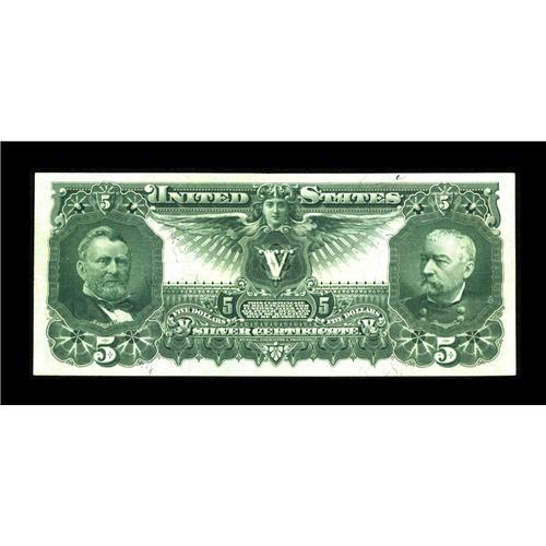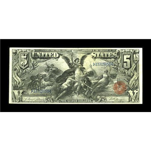 <B>Fr. 268 $5 1896 Silver Certificate Very Fine.</B></I> The center fold is a touch heavy, but does very little to interrupt the design. Overall, the broad margins and bright remaining details add to the eye appeal.<BR><BR><b>Shipping:</b> Coin/Currency (<a target="_blank" href="http://www.heritageauctions.com/common/shipping.php">view shipping information</a>)