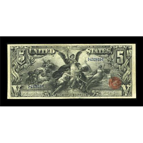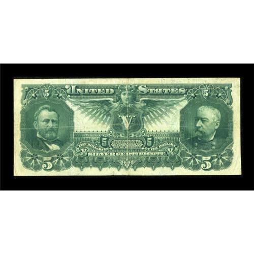 <B>Fr. 268 $5 1896 Silver Certificate Very Fine.</B></I> This hugely margined Ed Five is slightly compromised by a short tear at the bottom margin that just barely touches the design.<BR><BR><b>Shipping:</b> Coins & Currency (<a target="_blank" href="http://www.heritageauctions.com/common/shipping.php">view shipping information</a>)