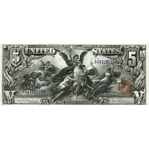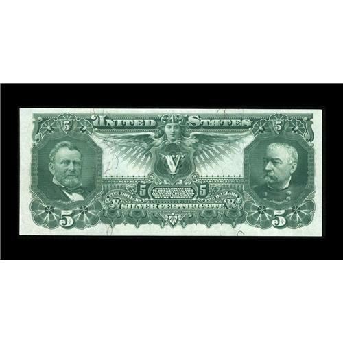 <B>Fr. 269 $5 1896 Silver Certificate About New.</B></I> The anchor denomination of the magnificent Educational Series and an especially presentable example that has all the richness of an AU or even a low-end Uncirculated note. In fact, only the obvious nature of the center crease precludes a full AU rating.<BR><I>From The Plymouth Rock Collection</B></I>
