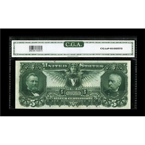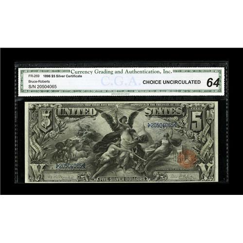 <B>Fr. 269 $5 1896 Silver Certificate CGA Choice Uncirculated 64.</B></I> The deep impression of the serial numbers can be easily seen through the encapsulation. This exceptionally attractive $5 Educational has certainly earned every point of its certified grade. We suspect that with just a touch more margin at bottom it would have been a candidate for 65 or higher. As it lays, it is a lovely note that will enhance the holdings of the collector fortunate enough to acquire it when the hammer falls tonight. Expect this beauty to realize in the vicinity of...<BR><BR><b>Shipping:</b> Coin/Currency (<a target="_blank" href="http://www.heritageauctions.com/common/shipping.php">view shipping information</a>)