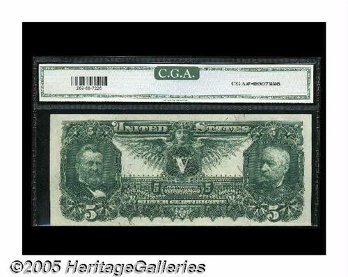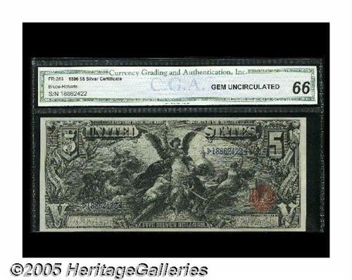 <B>Fr. 269 $5 1896 Silver Certificate CGA Gem Uncirculated 66.</B></I> This lovely $5 Educational has no prior auction history and only one public appearance, which was in a May 2000 Bank Note Reporter ad. The note is broadly margined, with spectacular color, and tremendous eye appeal. The original embossing can be seen through the third party holder on this flashy Fr. 269. This is the design type considered by many to be the pinnacle of the 19th century engraver's art.