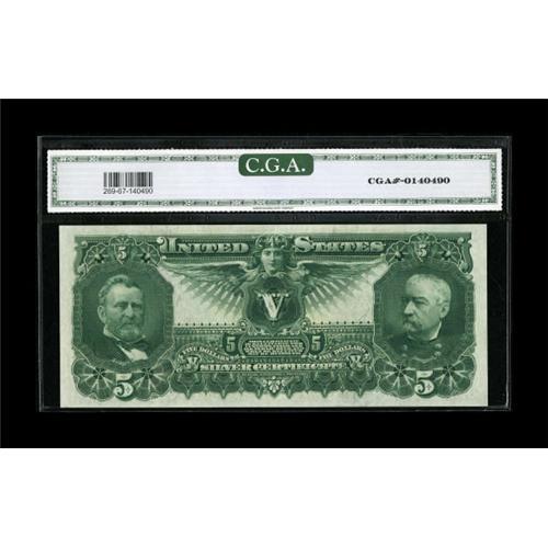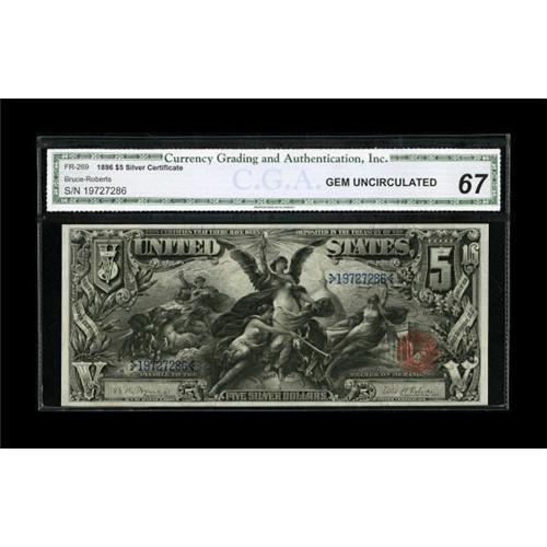 <B>Fr. 269 $5 1896 Silver Certificate CGA Gem Uncirculated 67.</B></I> A truly beautiful Five Dollar Educational, with outstanding margins, ideal colors and tremendous eye appeal. It certainly appears to be worth every point of its 67 grade. PMG very nearly agreed, as this note was cut out of a PMG 66 EPQ holder. The paper strip from that holder is included with the lot. PMG has graded an even hundred Fr. 269's up to this time, and they have only graded two pieces higher than the 66 they awarded this note: a single 7 and a single 8. We can locate no auction records for a PMG 66, but a PCGS 66 sold last March for $26,450. This PMG66/CGA67 note will certainly reach that level - and may well surpass it.<BR><BR><b>Shipping:</b> Coins & Currency (<a target="_blank" href="http://www.heritageauctions.com/common/shipping.php">view shipping information</a>)