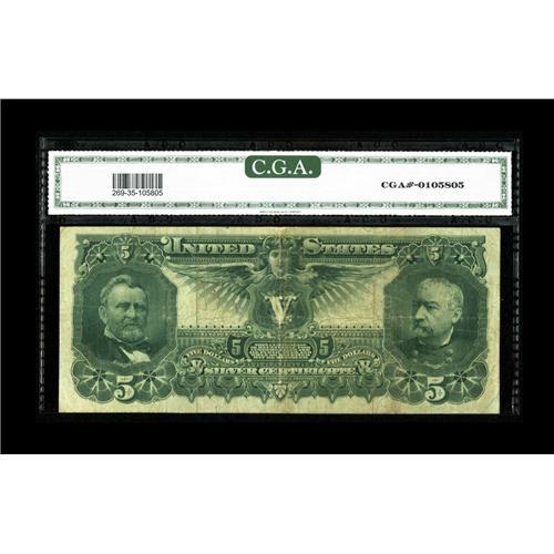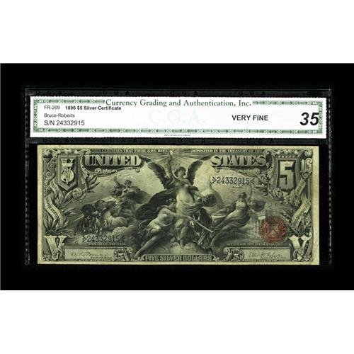 <B>Fr. 269 $5 1896 Silver Certificate CGA Very Fine 35.</B></I> Mid grade examples, especially those with the considerable eye appeal of tonight's offering, seem to have all but disappeared from the marketplace.<BR><BR><b>Shipping:</b> Coin/Currency (<a target="_blank" href="http://www.heritageauctions.com/common/shipping.php">view shipping information</a>)
