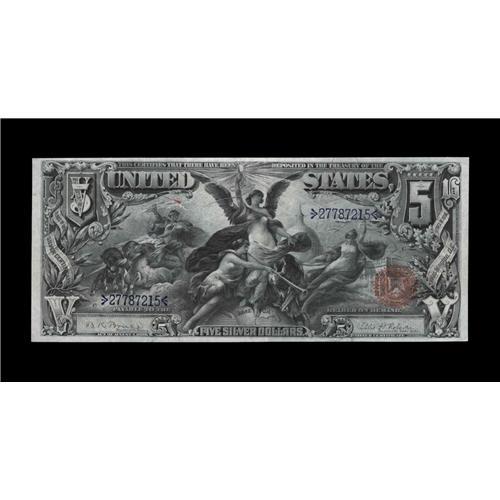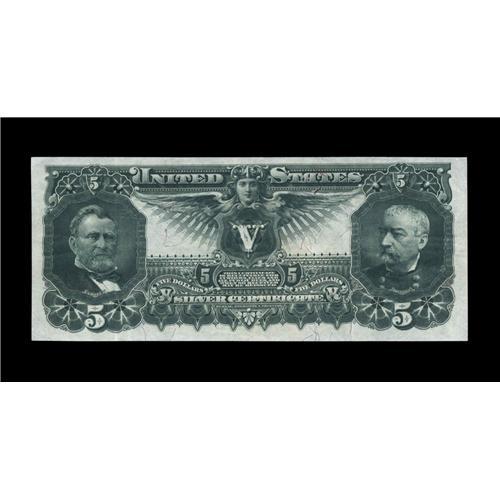 <B>Fr. 269 $5 1896 Silver Certificate Extremely Fine.</B></I> A spectacular XF note, with incredibly deep, original embossing, perfect paper surfaces and ideal color. It will likely take a bid well in excess of the expected XF level to bring this beauty home, as this is exactly the grade and appearance for which so many collectors strive. Few beautiful XF personality notes remain on today's market, as most have been smashed to simulate higher grades. Not this lovely piece.