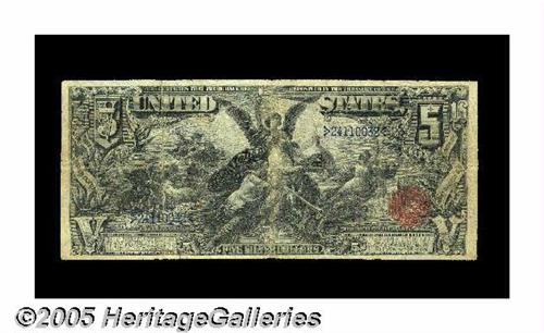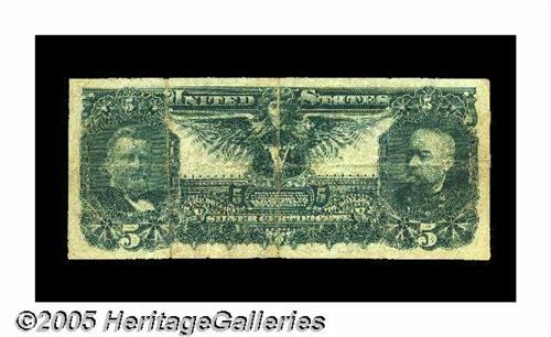<B>Fr. 269 $5 1896 Silver Certificate Fine-Very Fine.</B></I> A $5 Educational that is circulated, to be sure, but displays well-balanced centering. This example may have been carried as a keepsake, as the vertical folds are a tad on the heavy side.