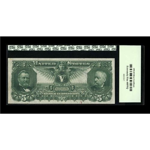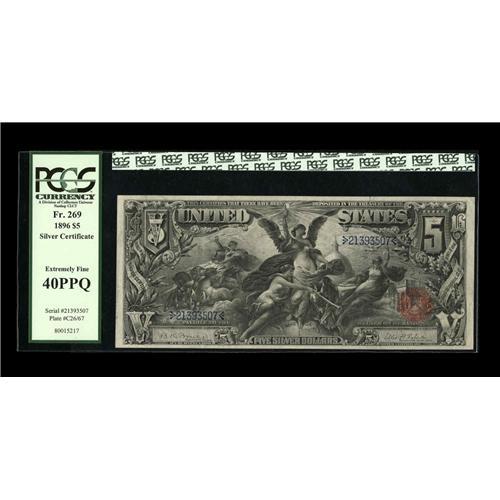 <B>Fr. 269 $5 1896 Silver Certificate PCGS Extremely Fine 40PPQ.</B></I> This Five Dollar Ed has ideal color and unusually broad margins all the way around on both sides. Arguably the most popular of all Type Notes, and in perfect collector grade.